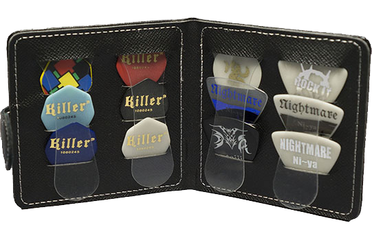 ギター・ピック専用の二つ折り革製ウォレットです。ピックを収めるスロットが12個あります。ピックの大きさや厚さにもよるでしょうが、1スロットに2〜3枚程度までなら収納できます。透明なプラスチック製のホルダーで、ピックが落ちないようにガードします。閉じるとマグネットの蓋がぴったりとくっつくので、ピックをバラけさせずに持ち運びできます。ちょっとしたプレゼントにもピッタリです。