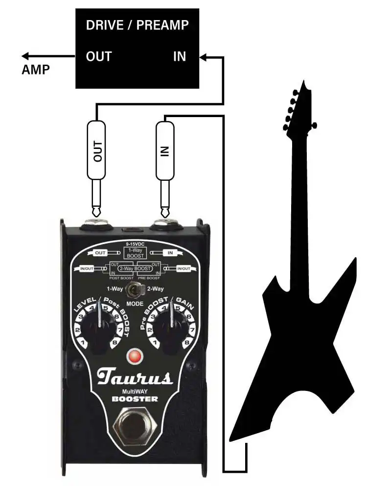 2ウェイのブースターとして使う場合、エフェクト・チェーンの中で2つの場所に接続できます。